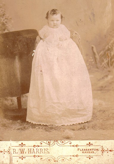 214. Harry Clifford 6 Johnson (Justus B.5, John4, John3, James2, Ann (Anne)1 Cooke), born 14 Sep 1834 in Cortland Co., NY; died 13 Feb 1913 in German Hospital, Kansas City, KS; buried in Prescott Cemetery, Linn Co., KS.. He married on 12 Sep 1861 in LaFayette, Stark Co., IL Susan Cevelah Todd, born 8 Mar 1843 in Carroll Co., MD; died 12 Sep 1920 in Prescott, Linn Co., KS; buried 16 Sep 1920 in Prescott Cemetery, Linn Co., KS., daughter of Alexander Todd and Eliza Ramsower.Notes for Harry Clifford Johnson According to Harry's son Laclede, Harry and his father had an argument. He left home after he finished school and never saw his family again. At the call to arms for the Civil War Harry enlisted as a Private on 15 Aug 1862 and mustered in 20 Sept 1862 in the Grand Army of the Republic, Company G, 112th Illinois Infantry. At the time his residence was listed as Weatherfield, IL. He served the entire war, being first under fire at Monticello, KY in the Spring of 1863. The Company raided over the mountains into East TN, returning in July to pursue and capture 500 Confederates at Danville. Many bloody campaigns in TN were culminated by the battle for Nashville. The Company was transferred to NC for the assault on Fort Anderson. Harry was mustered out on 20 June 1865 at Greensboro, NC and the Company returned to Chicago. At the time of discharge Harry had not been paid since 31 Aug 1864. Harry applied for a pension on 14 Aug 1890 (App. #863941, Cert. #970988). His widow Susan applied for a continuation of payments to her on 27 Mar 1913 (App. #1004695, Cert. #758931). In Harry's Civil War records he is described at light complexion, blue eyes, and black hair. He was a farmer who lived for one year after the war in IL and then moved to KS. In 1870 Harry lived in Liberty Township in Linn Co., KS. In 1870 the population of Liberty Township was 480, and in 1880 it had doubled to 994. In 1880 he farmed in Liberty Township (page 29) with his wife Susan C, children Wallace, Laclide C., Nettie M., and Ernest V., servant Lydia Sherwood (18 IA), and farm worker Otis Huff (13 KS). In 1900 Harry lived in Sheridan Township, Linn County; at home were Susan and children Ernest, Essie, and Gladys. In 1910 Harry and Susan lived on West 2nd Street in Prescott, Sheridan Township, Linn County; they listed having 7 children with 6 living. Harry and Susan are reported to have had a daughter Lydia, but in the 1900 census they reported having 7 children with 6 living. Those 7 are accounted for without a Lydia. They did have an unmarried servant Lydia Sherwood living with them in 1880. Obituary, Pleasanton Observer Enterprise, 6 March 1913: "Eulogy, Prescott, Kans., Feb 1913. It is fitting that I should say something as I was intimately acquainted and closely associate with Harry C. Johnson who passed out of life Feb. 13, 1913 at Kansas City, being there for treatment. He was an honored citizen, a devoted Christian, a loving husband, a kind and tender father, highly respected by all in the community. He was a man of perseverance and integrity; he crowned man-hood with the dignity of honor and the spirit of loyalty. The ineffable kindness of his smiles and the courtesy of his manner one could never forget. He was honest because it was his nature; he was congenial and found pleasure in making others happy. He was an advocate of peace in its broadest significance; he was optomistic - it was the most conspicuous trait in his combination. He was at all times hopeful and lived on the sunny side. He had a chance to test his patriotism when he was a young man. He loved his country and was a soldier in the Civil war. He kissed his young wife and went to the field of battle leaving her to mourn his absence, while he would defend his country's flag. When the war ended he returned to again meet his companion in hopes of remaining. He at once planned a prosperous life and succeeded admirably. Politically he was a true republican. He was a devouted member of the M. E. Church, was a faithful attendant and was liberal with money in its support. He was responsive to the wants of the poor. He owned a beautiful residence in Prescott where he lived several years and was happy in his home. As he was afflicted it was considered an operation was necessary. With a manly quality of courage and in the tenderness of his heart, he bade us a very affectionate farewell. In a few days he was returned, prepared for burial. We gathered around the casket; the once smiling face was now cold in death. He had fought a good fight; he had finished his course; he had kept the faith and was worthy of the crown. The town and church have lost one of the best citizens. A. L. Johnson" MARRIAGE: They were married by A. J. Wright. Notes for Susan Cevelah Todd In 1850 Susanah was listed as 8 years old, with her family in 5th District, Carroll Co., MD. In 1860 Susan (17 MD) lived in Goshen Township, Stark Co., IL with the Theodore F. Hurd family; he was a merchant from NJ with property valued at $1,000 and goods at $15,000. Pleasanton Observer Enterprise, 27 Feb 1913: "Mrs. H. C. Johnson and daughter, Mrs. Carpenter, were in Mound City Thursday transacting business with the Probate Court." In 1920 Susan lived alone in Sheridan Township, Linn Co., KS (page 3). Obituary, "Pleasanton Observer Enterprise," 23 Sept 1920: "Susan C. Todd was born in Carroll county, Maryland March 8, 1833 and departed this life at her home in Prescott Sept. 12, 1920, aged 77 years, 6 months and 4 days. She removed with her parents to Lafayette, Illinois in her girlhood, and was there united in marriage to Harry C. Johnson Sept. 12, 1861. To his union were born three sons and four daughters. Her husband and two daughters had preceeded her to heaven, leaving three sons, Lewis Johnson, of Centerville, Clede Johnson, of Henyetta, Oklahoma, and Ernest Johnson of Prescott, and two daughters, Mrs. Essie Carpenten, of Denver, Colorado and Mrs. Gladys Johnson of Garland, Kansas; one brother, B. M. T