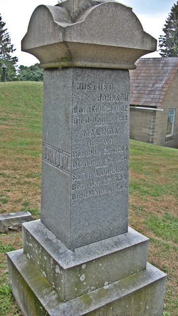 107. Justus B. 5 Johnson (John4, John3, James2, Ann (Anne)1 Cooke), born 28 Feb 1802 in Schoharie Co., NY; died 11 Jan 1883 in Marathon, Cortland Co., NY; buried 14 Jan 1883 in Marathon Cemetery, Marathon, Cortland Co., NY. He married (1) Malinda A. (---), born 26 Jul 1805 in NY; died 26 Jun 1851 in Marathon, Cortland Co., NY; buried in Marathon Cemetery, Marathon, Cortland Co., NY; (2) Priscilla Smith, born 1807/09 in Cortland Co., NY; died 17 Sep 1880 in Texas Valley, Cortland Co., NY; buried in Marathon Village Cemetery, Cortland Co., NY, daughter of Nathan Smith and Rachel (---).Notes for Justus B. Johnson NOTE: The link to parents is uncertain. Justice reported both parents born in CT. His propsed father John Jr. lived in Schoharie Co., NY in 1800 and 1810, where the NY State Cenus places Justice's birth. John Jr. moved to Lisle, Broome Co., NY by 1820, and at that time he had a son 16-18. (Abner Johnson has been suggested as his father, but he was still in CT in 1800 and 1810 and unlikely to have had a son born in NY.) In 1830 Justus lived in Lisle, Broome Co., NY (page 119) with a wife and two sons, one under 5 and the other 5-10. There appears to have been a son born before Charles. Justus bought his 63 acre farm From Ann and Washington G. Johnson on 4 March 1836 (Cortland County Deed 7-528) for $1200; this was Military Lot no. 21. Washington lived in Marathon and Justus lived in Lisle. The witness was G. E Peck and the deed was recorded 22 January 1844. In 1840 J. B. lived in Marathon, Cortland Co. NY (page 55) (211010000000-0100010000000). In 1850 Justice lived in Marathon (page 239). In 1855 Justice farmed in Cortland Co. (M-1:7) with wife Persilla, sons Alfred and Rufus, and Lucinda Payne, age 16 from Cortland Co. In 1860 Justus farmed in Marathon (page 502) with his wife Priscilla and son Alfred (farm laborer); the value of his land was $4,000.00 and personal assets of $1,000.00. In 1869 he farmed on lot 71 in Marathon. In 1880 he was a retired farmer residing in Marathon (page 179) with his wife Priscilla. Cortland County Probate File x 7354s. Will dated 17 November 1882, was made when Justice was 80 years old. Heirs listed as Alfred Johnson of Marathon, New York; Charles Johnson of Triangle, Broome County, New York; Hannah Glover of Cincinnatus; Harry C. Johnson, LaCygne, Linn County, Kansas; Rufus Johnson, Drywood, Chippewa County, Wisconsin. Left $200 for a cemetery lot and monument and removal of family members to that lot. $50 each to sons Charles and Rufus or their heirs after 5 years; real estate to son Alfred with whom Justice was living, Alfred to be executor. Witnessed by George A. Hubert (An Attorney), George H. Chaplin, Eugene Johnson, all of Marathon. Notes for Priscilla Smith In 1850 Priscilla was a widow living in Cortland Co., NY with her 4 children. Priscilla was buried in Nathan Smith's lot in Marathon Cemetery. Children of Justus B. Johnson and Malinda A. (---) were as follows: 211 i Charles + 212 ii Hannah Louise 6 Johnson, born 9 Mar 1832 in Broome Co., NY; died 1906. She married John Henry Glover.213 iii Seth A. 6 Johnson, born 2 Jan 1834 in Marathon, Cortland Co., NY; died 18 Mar 1854 in Marathon, Cortland Co., NY; buried in Marathon Cemetery, Marathon, Cortland Co., NY.+ 214 iv Harry Clifford 6 Johnson, born 14 Sep 1834 in Cortland Co., NY; died 13 Feb 1913 in German Hospital, Kansas City, KS; buried in Prescott Cemetery, Linn Co., KS.. He married Susan Cevelah Todd.+ 215 v Alfred Eugene 6 Johnson, born Oct 1839 in Cortland Co., NY; died 19 May 1921 in Marathon, Cortland Co., NY; buried in Marathon Cemetery, Marathon, Cortland Co., NY. He married Harriette Estella Yarington.+ 216 vi Rufus J. 6 Johnson, born Jun 1842 in Cortland Co., NY; died 10 Oct 1906 in Chippewa Co., WI. He married Helen M. (---).Justus and Malinda's Tombstone 113. H. Deloss 5 Johnson (Jabez4, John3, James2, Ann (Anne)1 Cooke), born Jul 1826 in Cortland Co., NY; died 1900 in Cortland Co., NY; buried in Marathon Village Cemetery, Cortland Co., NY. He married (1) Emeline (---), born Jan 1832 in Cortland Co., NY; died 14 Sep 1881 in Cortland Co., NY; buried in Marathon Village Cemetery, Cortland Co., NY; (2) in 1882/83 Martha Hillelnger, born Jul 1836 in NY; died 1905 in Cortland Co., NY; buried in Marathon Village Cemetery, Cortland Co., NY.Notes for H. Deloss Johnson In 1900 Deloss was a retired farmer in Marathon, Cortland Co., NY (page 215) with his wife Martha, niece Elizabeth Johnson (Nov 1862 NY, married 21 years, 6 children with 4 living), and two boarders. He had no children by Martha. Children of H. Deloss Johnson and Emeline (---) were as follows: 217 i Lewis 218 ii Jesse 6 Johnson, born 1852/53 in Cortland Co., NY.