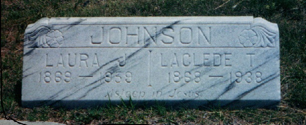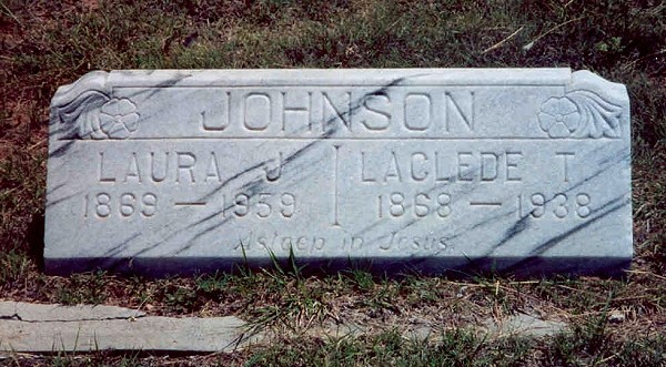 309. Laclede Todd 7 Johnson (Harry Clifford6, Justus B.5, John4, John3, James2, Ann (Anne)1 Cooke), born 9 May 1868 in Pleasanton, Linn Co., KS; died 6 Mar 1938 in Ashland, Clark Co., KS; buried in Ashland Cemetery, Ashland, Clark Co., KS. He married on 30 Jun 1889 in Parker, Linn Co., KS Laura Jane Springer, born 29 May 1869 in Quincy, Adams Co., IL; died 19 Jul 1959 in Pratt County Hospital, Pratt, Pratt Co., KS; buried 21 Jul 1959 in Highland Cemetery, Ashland, Clark Co., KS, daughter of William Simms Springer and Mary Ann Burnett.For the parents of Laura Jane Springer, see Springer family insert below. Notes for Laclede Todd Johnson In 1900 Laclede was a blacksmith residing on Main Street in Amsterdam Town, West Point Township, Bates Co., MO (page 83) with his wife Laura and daughter Golda; they had been married with 3 children, 2 living. In 1905 they in Garfield, Kiowa Co., KS. About that time Laclede moved to a farm near Mullinsville, KS. In 1910 he farmed in Martin, Kiowa Co., KS with Laura and children Ora, Golda, Myrtle, and Herald. In 1915 they claimed a farm in OK; they joined the Baptist Church. In 1927 they moved to a farm west of Dodge City, KS. In Aug 1934 Laclede moved to Ashland, KS; all the children had married and moved out. In Oct 1937 he went out to the farm of their son, Harold, to look after it while he was away. In Feb 1938 he took ill and returned to Ashland. Laclede's obituary reads: "He was always a kind and loving husband and father and was a good friend and neighbor, always helping wherever he could. He was a cheerful nature, keeping the spirit of youth to the last. A great number of friends mourn his departure." MARRIAGE: They were married by the Rev. J. S. Payne. At the time Laclede was from Goodrich, Linn Co. and Laura from Parker, Linn Co. Notes for Laura Jane Springer In 1880 Laura lived with her mother and brother Charles in Washington Township, Wapello Co., IA (page 225). The 1900 census lists laura and both her parents born in Iowa. MARRIAGE: They were married by the Rev. J. S. Payne. At the time Laclede was from Goodrich, Linn Co. and Laura from Parker, Linn Co. Children of Laclede Todd Johnson and Laura Jane Springer were as follows: + 339 i Ora Earl8 Johnson, born 6 Jul 1890 in Parker, Linn Co., KS; died Feb 1971 in Dodge City, Ford Co., KS. He married Effie Jeanette Perkins. + 340 ii Goldie Ann (Golda)8 Johnson, born 19 Jun 1893 in Mound City, Linn Co., KS; died 29 Oct 1991 in Torrance, Los Angeles Co., Ca. She married (1) Jesse Aaron Turner; (2) Diamond Joe (Shorty) Nabors. 341 iii Laura Jane8 Johnson, born abt 1896 in KS; died abt 1898 in KS. Notes: Laura died at age 2 (also reported age 5). She fell off a porch and broke her neck or back + 342 iv Myrtle E.8 Johnson, born 3 May 1901 in KS; died 2 Apr 1987 in Spokane, Spokane Co., WA. She married (1) Jesse Edward (Sol) Swisher; (2) Houston D. Gilstrap; (3) Glen Hutchinson. + 343 v Harold Vernon8 Johnson, born 1904/05 in Mullinsville, Kiowa Co., KS. He married (1) Agnes W. M. Gould; (2) Jewell (---). + 344 vi Harry Clifford8 Johnson, born 23 Oct 1910 in Mullinsville, Kiowa Co., KS; died 10 Jun 1965 in Dodge City, Ford Co., KS; buried in Maple Grove Cemetery, Dodge City, Ford Co., KS. He married (1) Martha Barbara Pyle; (2) Lorraine McMullan.