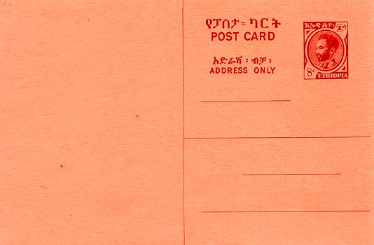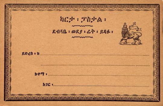 Printed 15-17 June 1896. A total of 61,275 cards were delivered to Chefneaux in Paris on 15 July 1896. A reported 3,000 sets were sent to Ethiopia, however there may have 6,000 of the 1 guerche as 3,219 of them were inventoried in 1903. The balances were held in France and sold to collectors by A. Maury. They later appear with French stamps in 1936-1941. The Amharic reads: Post Card / Write Correspondence on Reverse. |